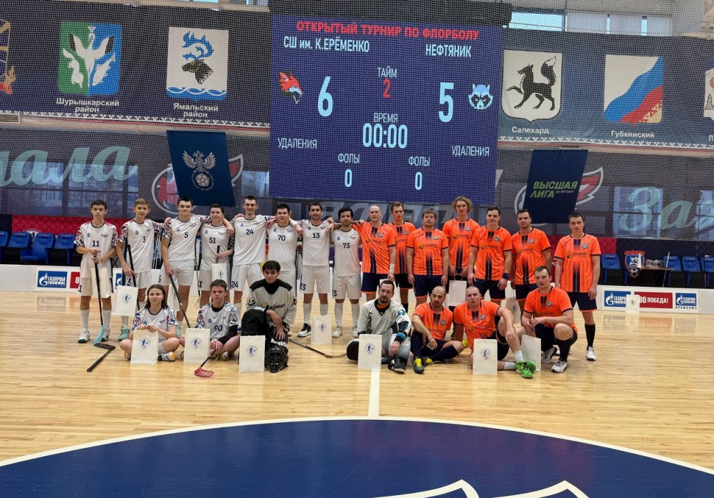 На протяжении двух дней в ДЦ «Ямал» шесть команд сражались за победу в открытом турнире по флорболу, посвященном 80-летию Победы в Великой Отечественной войне.